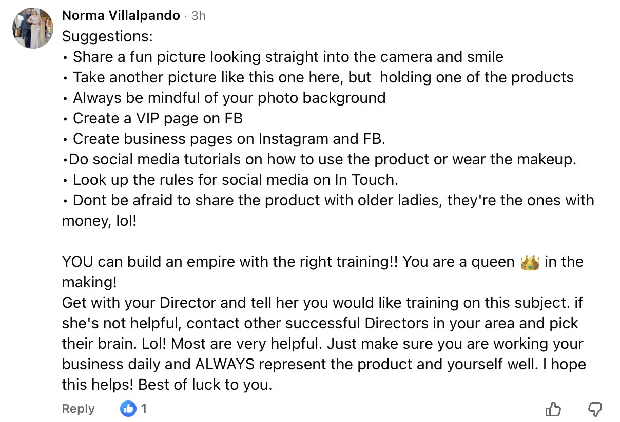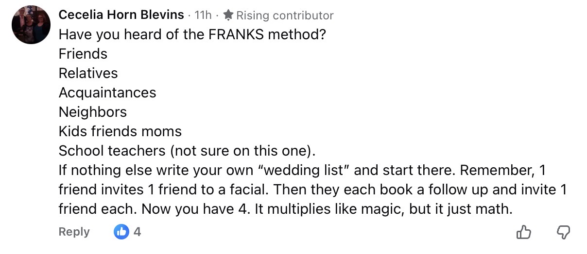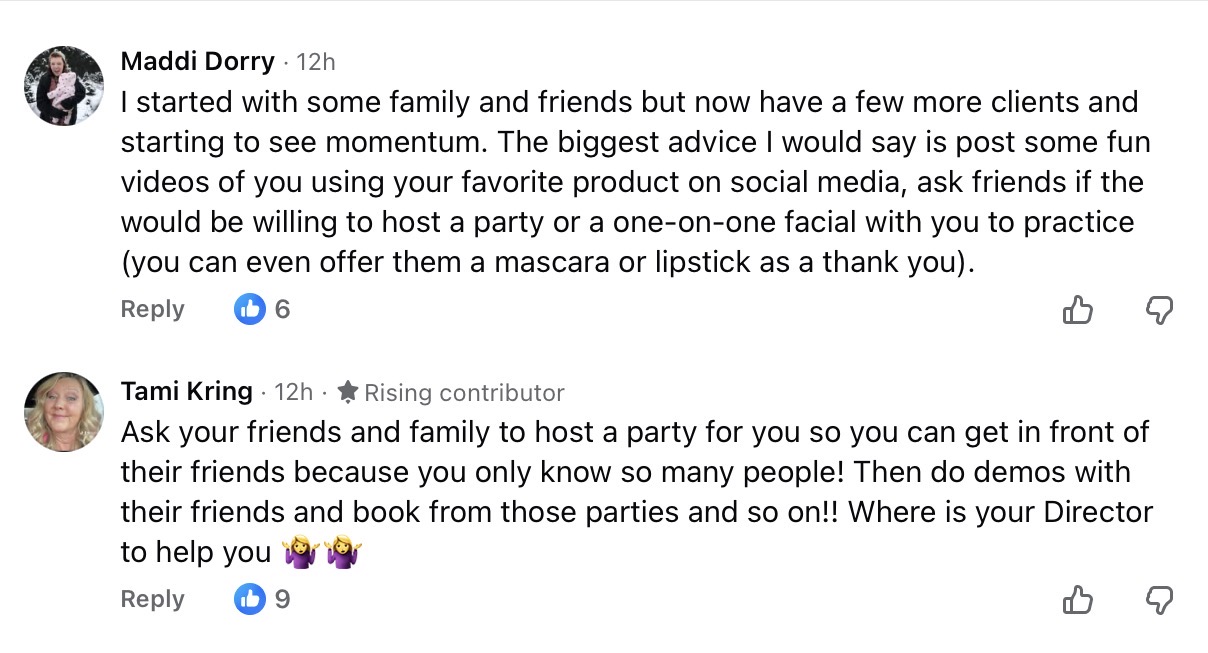 Jessie Wangeman shares that she should use a great profile picture so isabella is easily recognized. Share her beauty routine. Ask questions on posts to get responses. Join local groups. Let customers know you can offer a 10 minute “facial”. And most importantly, don’t give up.