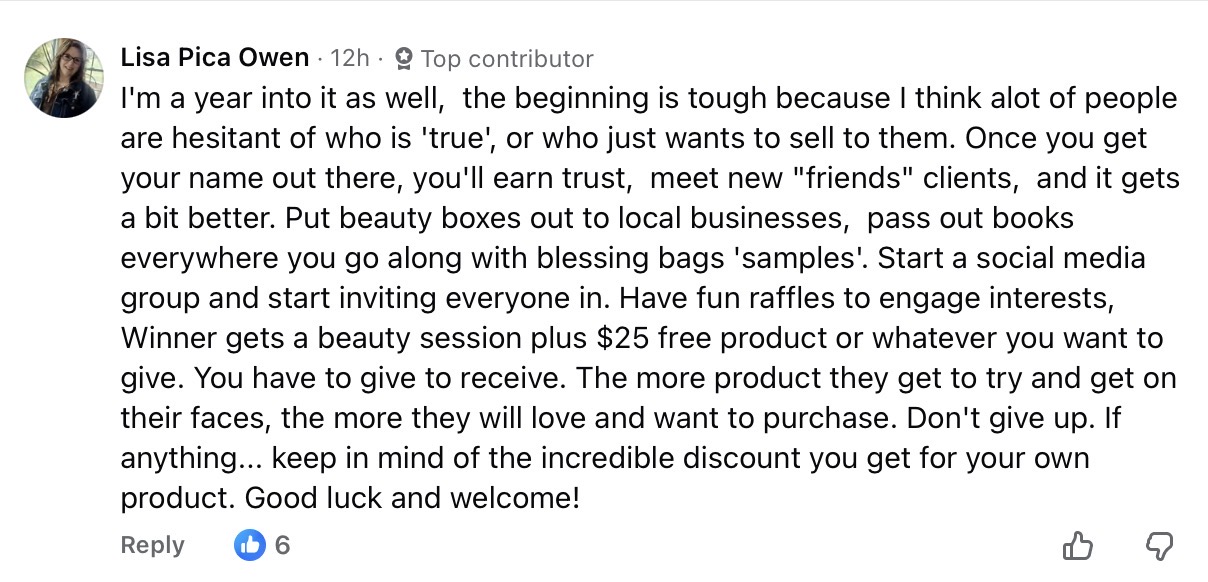 Lisa Owen has been in for a year. She recommends using facial boxes. Give out samples everywhere you go. Start a Facebook group and invite everyone you know to join. If you don’t get customer sales, remember that you get a discount on your personal use products!