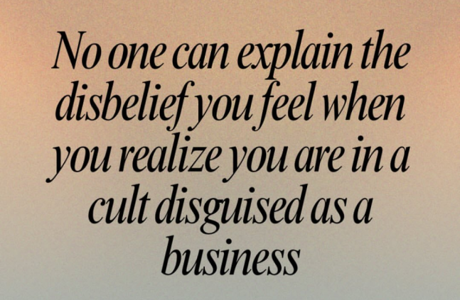 “No one can explain the disbelief you feel when you realize you are in a cult disguised as a business.”