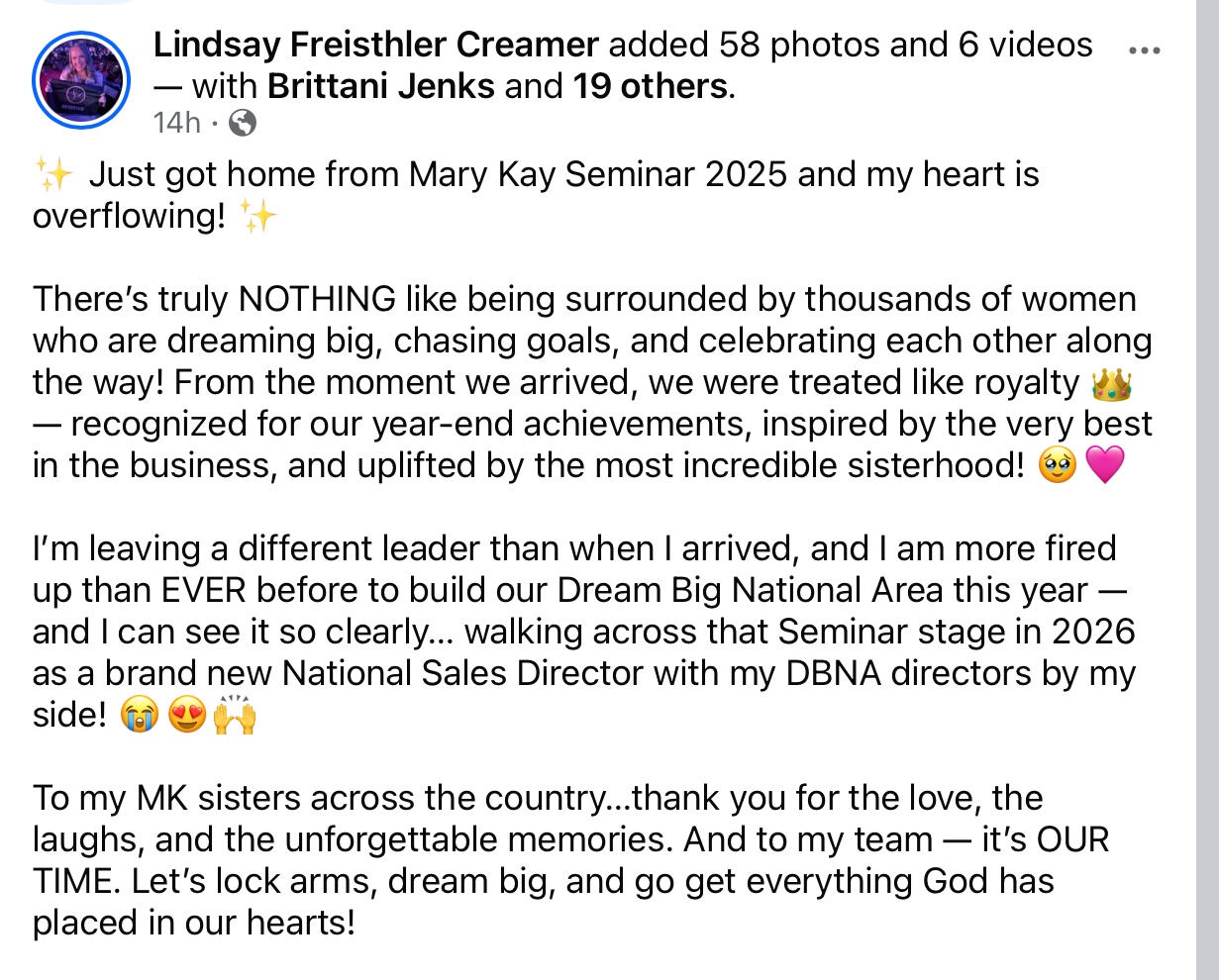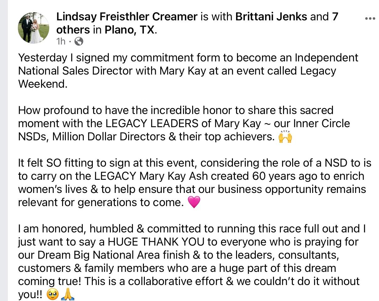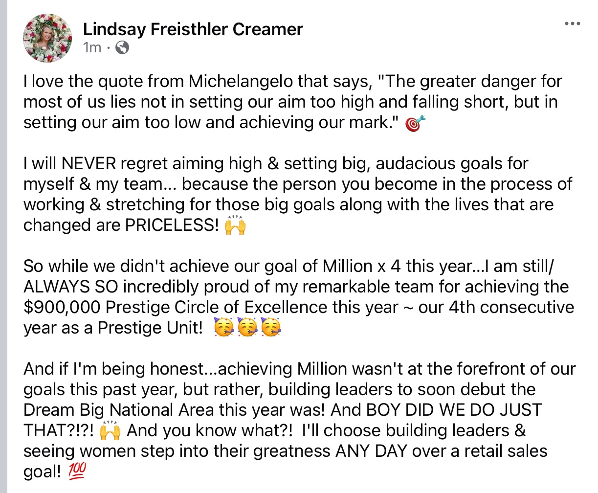 In March 2024, Mary Kay sales director Lindsay Creamer boldly declared she would debut her Dream Big National Area by June 30th!