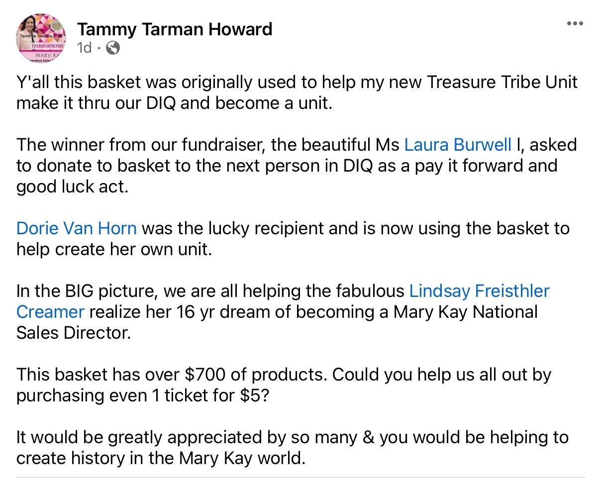 Tammy and Dorie both sold raffle tickets to raise money to buy inventory. The gift basket had $700 worth of Mary Kay products.