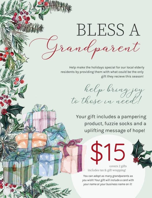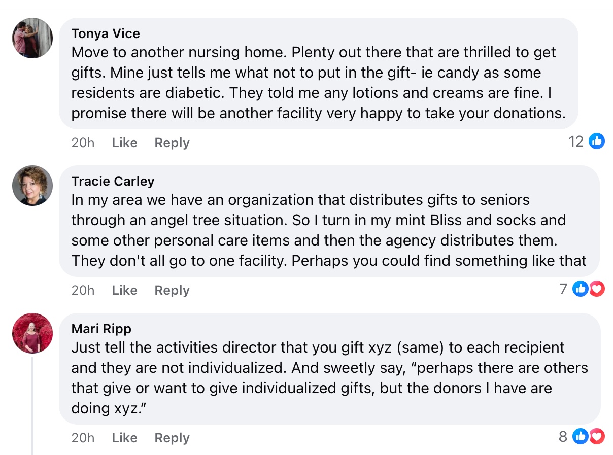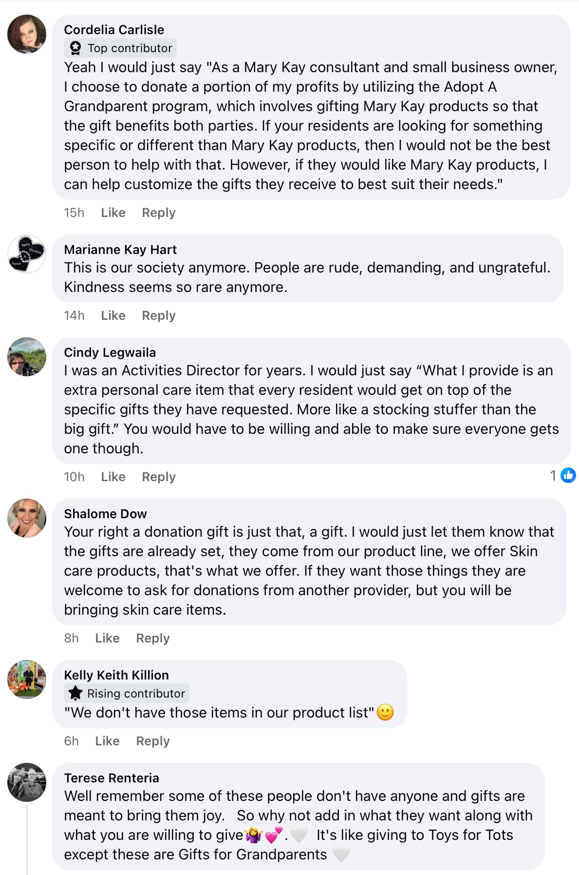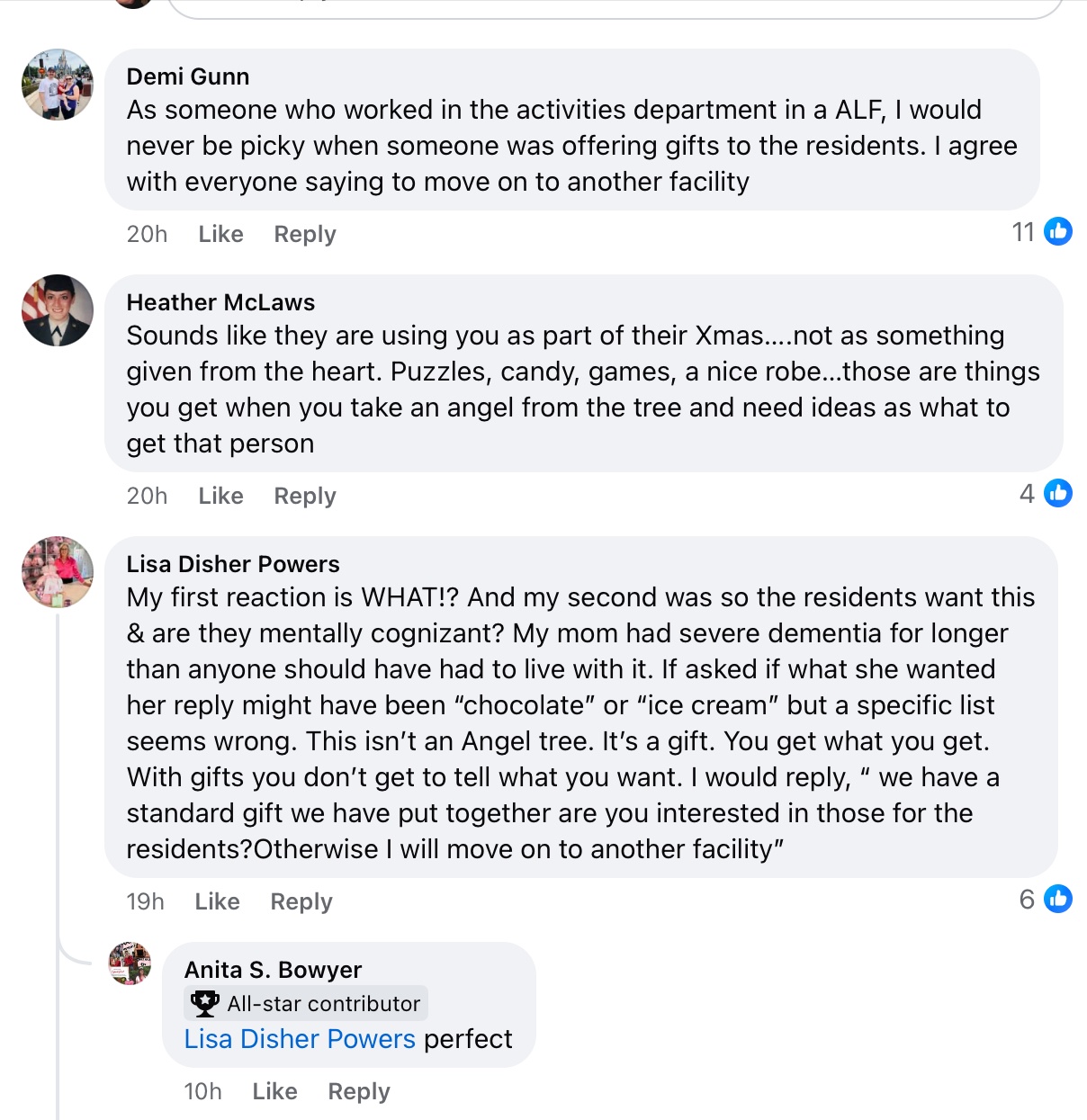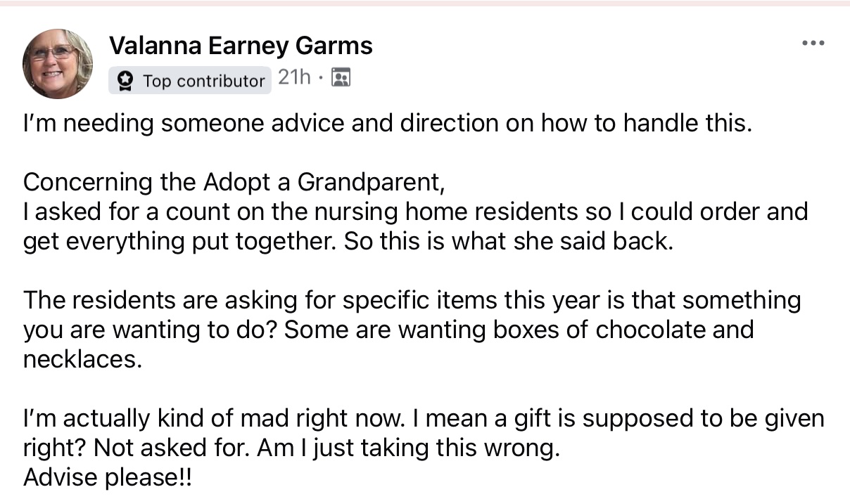 Demi Gunn says she would never be picky over gifts that are given to residents. What if someone gave each resident a cat? Or a bowling ball? Lisa Dasher Powers wonders if the residents of that home are mentally cognizant! They could have dementia! Adopt a Grandparent is not an angel tree. It is a gift. You get what you get!