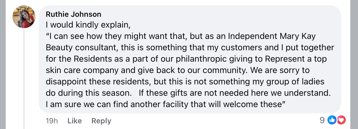 Nursing homes get offers like this from many different MLM’s not just Mary Kay. All of this product dropped off at the home for the staff to manage and most likely throw out. But at least the consultant got pics for social media and some production credit. Ho ho ho!