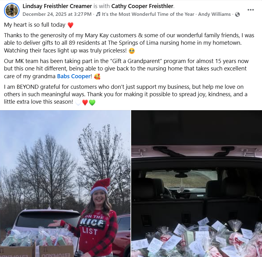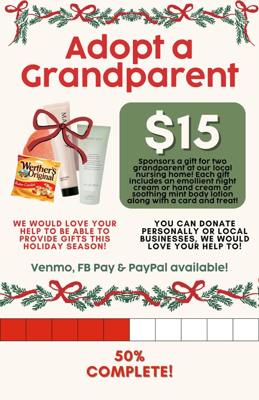 Every holiday season, several Mary Kay consultants and directors will promote “Adopt a Grandparent”. They ask customers to buy product at Mary Kay cost, which is then donated to a nursing home. The consultant isn’t making any profit, but is receiving wholesale credit for their monthly production totals. Instead of asking homes what products are most needed, the consultants will donate Mary Kay hand or feet lotion and may throw in some candy or a crossword puzzle.