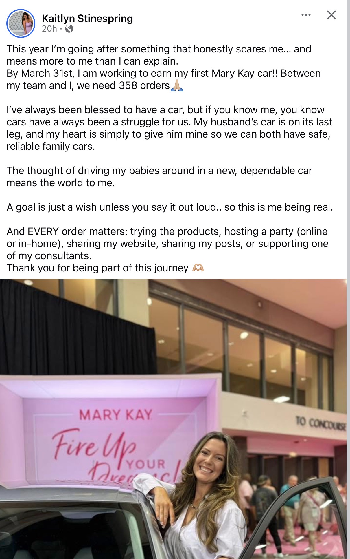 Kaitlyn Stinespring would like to earn her first Mary Kay car. She’s on the path to a win, also begging for orders from her followers. She just needs $35,800 in wholesale orders from her credit card and downline.