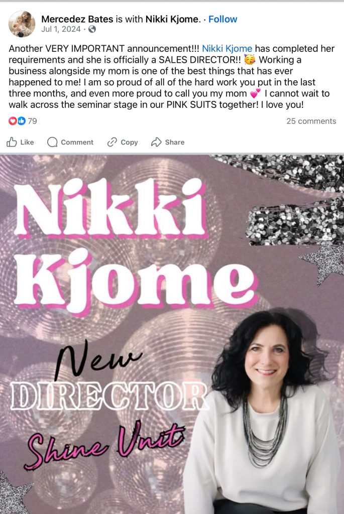 Kayla Watts and Carrie Cardwell (formerly Zuberer) are directors who both want to earn back the use of the Pink Cadillac. They were driving Cadillac in 2022 for Jamie’s first Pink Cadillac Directors Retreat aka Losers on Beach (along with 9 other directors) but had lost them by the time Jamie had her second in 2024.(when she had just 4 Cadillac directors). As of the beginning of 2026, only 4 of her directors are in Cadillacs.